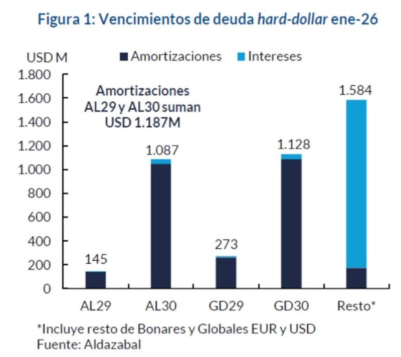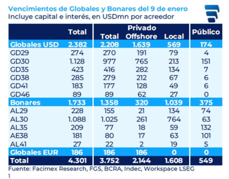 En detalle, el 9 de enero el Tesoro tendrá que afrontar vencimientos por u$s 4300 millones entre Globales y Bonares, de los cuales u$s 2800 millones son amortizaciones de capital y u$s 1500 millones pagos de intereses.
