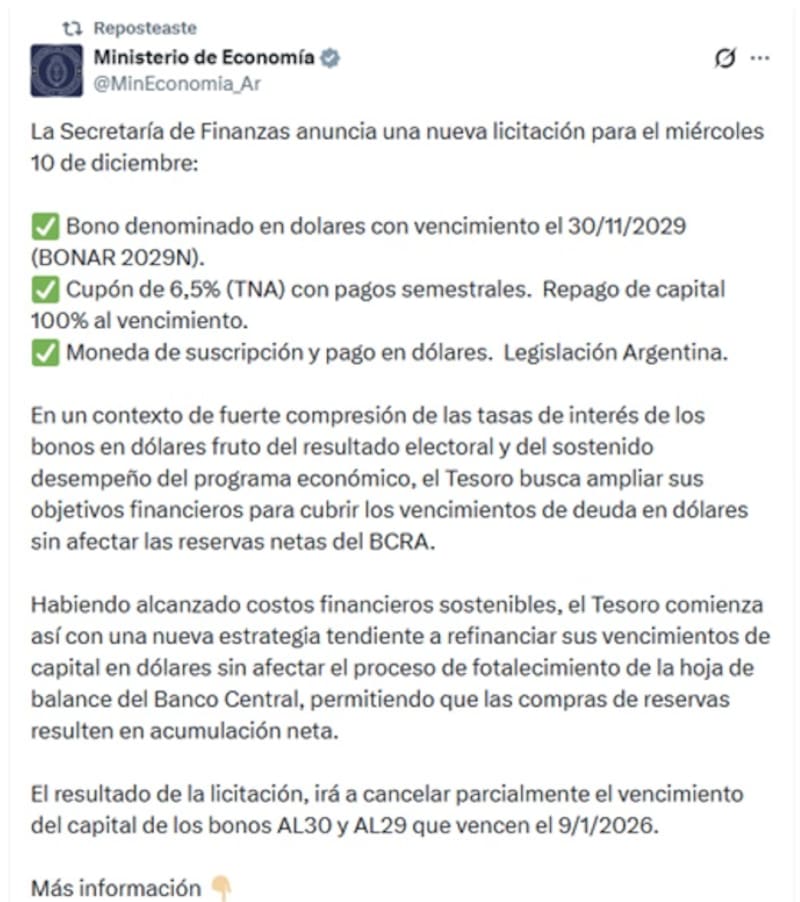 Los analistas de Research Mariva explicaron que el principal objetivo del gobierno con esta emisión es financiar el pago del capital con vencimiento el próximo 9 de enero de 2026 (bonos AL30 y AL29), sin afectar las reservas netas del BCRA.
