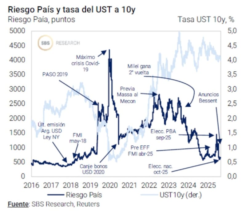 Tras el resultado de las recientes elecciones legislativas y el sostenido desempeño del programa económico, el EMBI+ de Argentina ha caído a alrededor de 637 puntos básicos, alcanzando niveles accesibles para la emisión en el mercado.