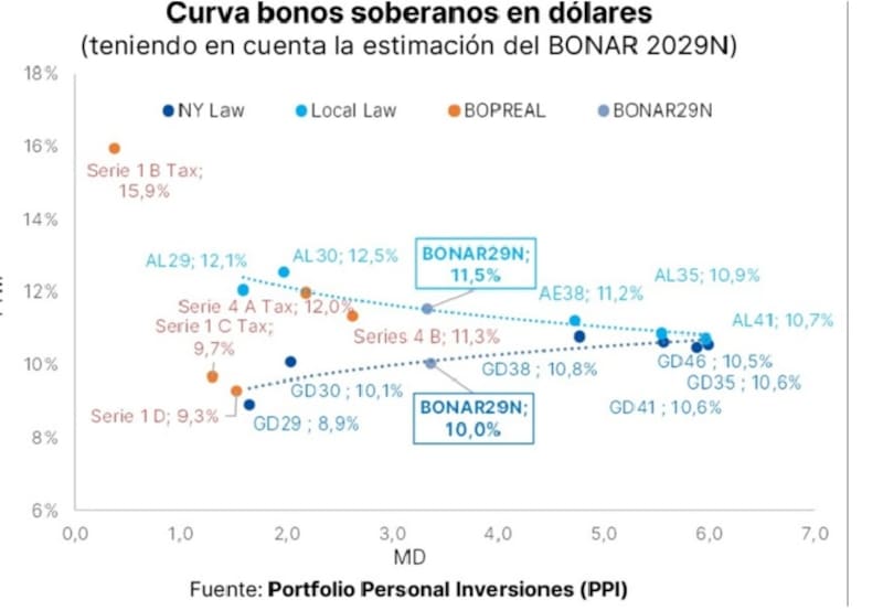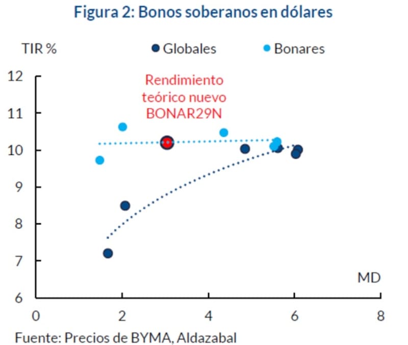 En relación al precio del bono, desde y Aldazabal Cia agregaron que, dada la duration y los precios actuales, el rendimiento teórico del nuevo Bonar debería ubicarse sobre la curva soberana de Bonares y estaría en torno a 10,2%.