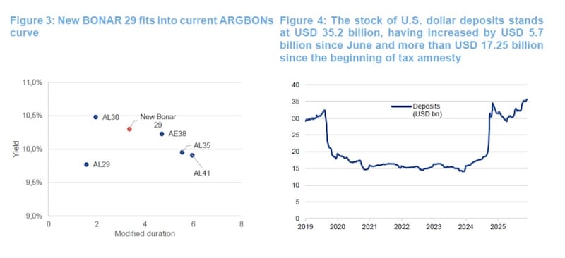 “Creemos que esta primera emisión podría servir como una señal de la capacidad del gobierno de refinanciar sus vencimientos de corto plazo y contribuirá a una compresión adicional del riesgo país en las próximas semanas, lo que facilitaría una nueva emisión durante el primer semestre de 2026 a tasas más bajas. Este efecto podría verse reforzado si es acompañado con resultados positivos en el Congreso y acumulación de reservas”, anticiparon.