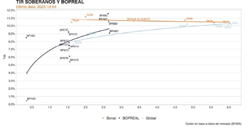 La curva de Bonares rinde 12% en el AL29 y 12,5% en el AL30. Sin embargo, por duration, el nuevo Bonar 2029 debería cotizar cercano a los 11,5% de TIR.