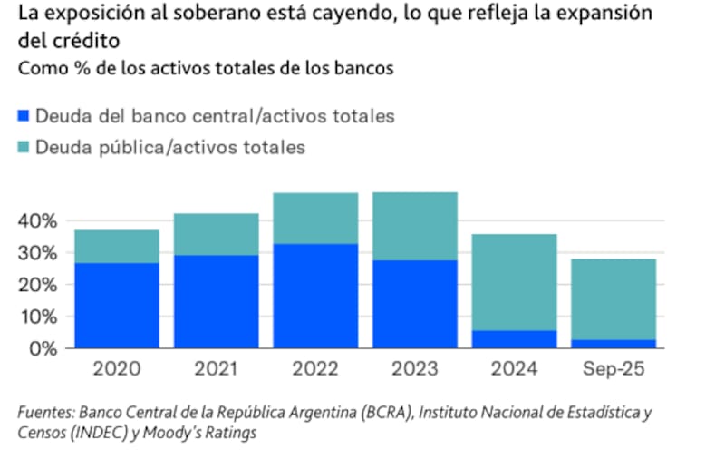 El sistema bancario argentino no enfrenta hoy un problema de liquidez, analiza Moody’s. Los bancos operan con niveles holgados de efectivo y activos líquidos, y el fondeo descansa principalmente en los depósitos de clientes, que se mantienen estables y constituyen la base del financiamiento del sistema. En ese sentido, no hay señales de estrés inmediato ni tensiones en la capacidad de los bancos para cumplir con sus obligaciones de corto plazo.