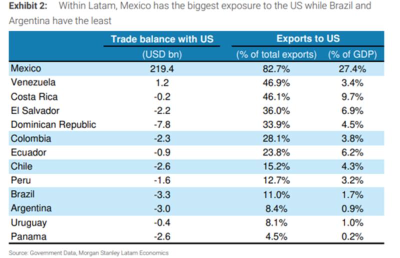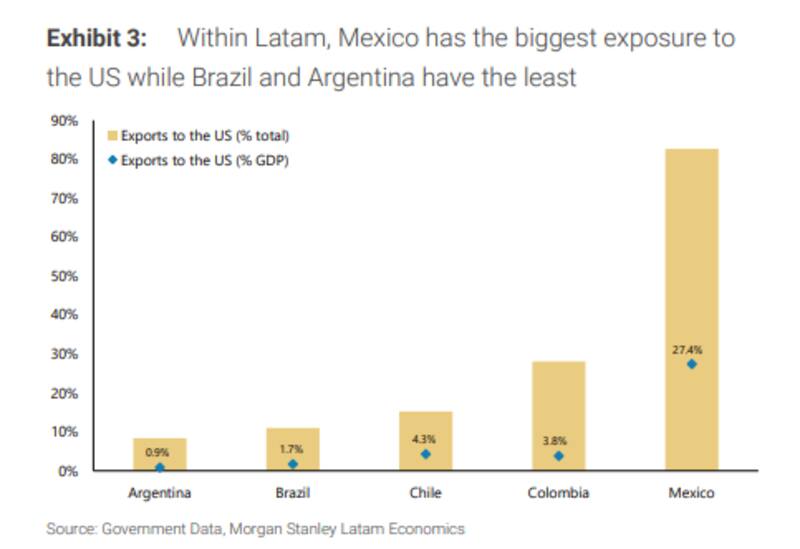 En ese sentido, los analistas de Morgan Stanley no ven un fuerte impacto en el país. Según sus estimaciones, las exportaciones de Argentina a EE.UU. son solo el 8% de las exportaciones totales del país.