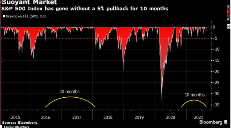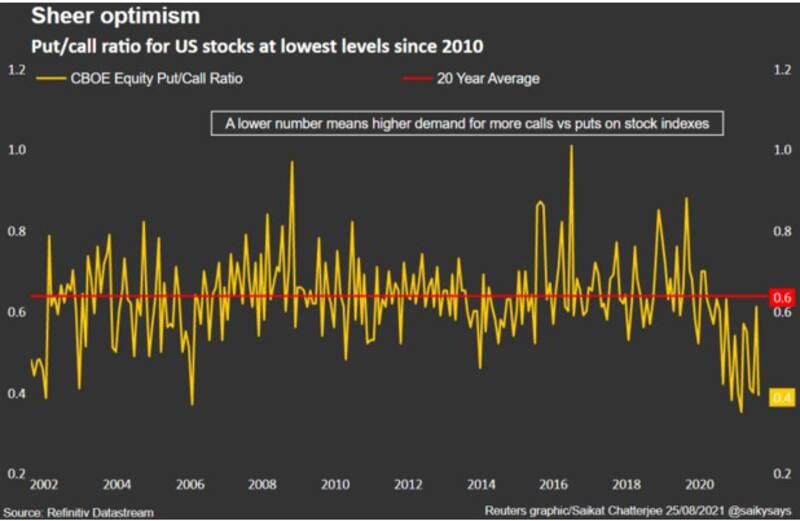 A pesar de las preocupaciones de la variante Delta, los inversores permanecen fuertemente posicionados hacia una mayor alza en el mercado de valores. Un ratio put/call tan bajo implica que más participantes esperan que el mercado suba en vez de que baje.