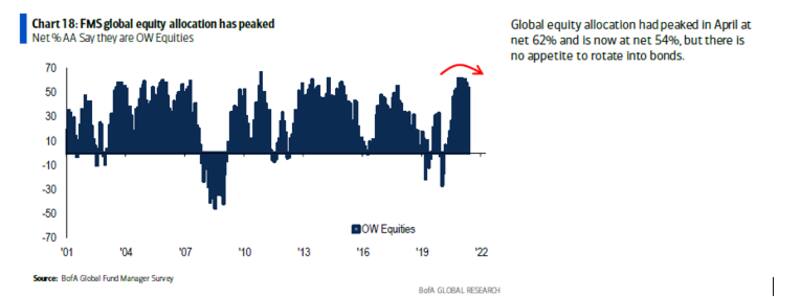 Si bien se redujo frente a un 62% desde abril, la encuesta refleja que aún no hay apetito para salirse de acciones y pasar a bonos, por lo que los inversores siguen sobre-ponderando las acciones dentro de las carteras.