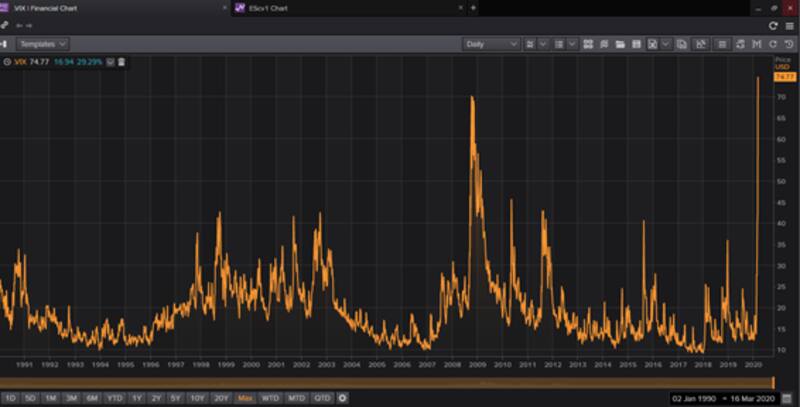 El índice del miedo, que mide la volatilidad en las acciones americanas superó su mayor nivel en la historia. Hasta ahora, el récord había sido tras la quiebra de Lehman Brothers en 2008, alcanzando valores de 70 puntos. Actualmente el índice toca los 74 puntos y se ubica en un techo histórico.