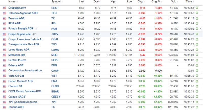 Los ADR argentinos en Wall Street operan mixtos. Del lado bajista se destaca Despegar, Telecom y Ternium que bajan 1,5%, 1,1% y 1,04%.