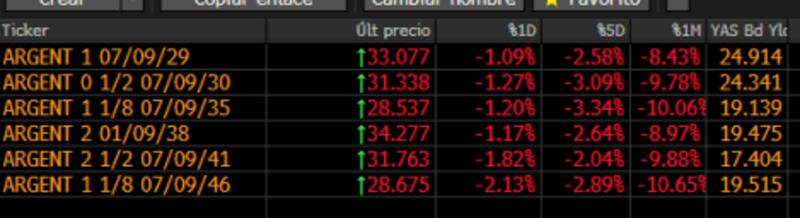 En el acumulado del último mes, los bonos caen hasta 10,65%. Con esta nueva baja, los títulos más cortos pasan a rendir 25% mientras que en el tramo más largo la deuda se acerca a rendimientos del 20%.