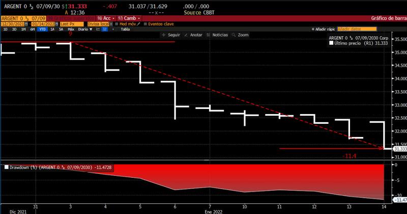 En lo que va del año, el Global 2030 operó todos los días a la baja. Cayó todos los días del 2022 Acumula una baja del 11,5%, lo cual elevó la probabilidad de default al 95% y las paridades colapsaron.