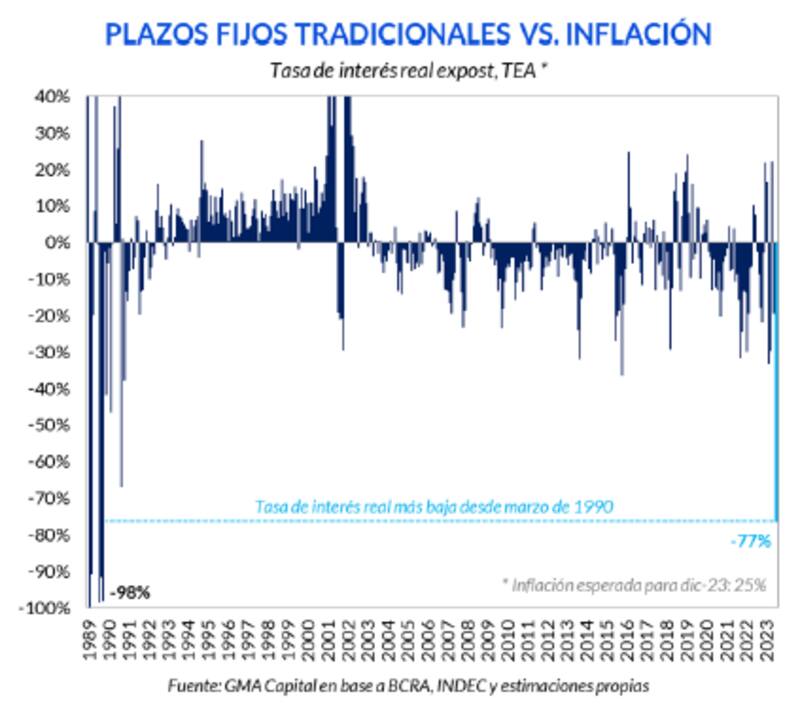 "Estimamos que el premio de los pesos en el último mes del año quedará sumamente rezagado respecto del incremento del costo de vida. Los fríos números del Excel son despiadados con el ahorrista. Muestran una tasa real esperada de -77% (TEA), la más deprimida desde marzo de 1990", detalló Persichini.