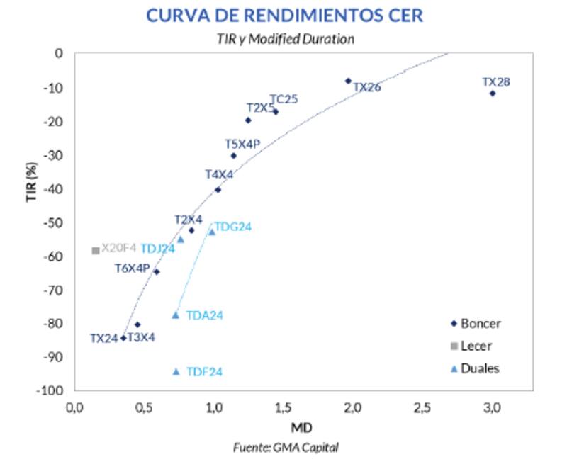 Todo esto en un contexto en el que los bonos CER operan con paridades de hasta 150%, un S&P Merval en CCL bastante por encima de lo que la relación histórica con el Riesgo País sugiere y bonos dollar linked que se ven afectados por un bajo carry.