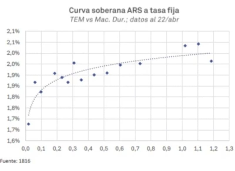 “El dato de 3,4% del IPC de marzo genera mucho ruido sobre las tasas, porque el CER correrá a ese ritmo mensual hasta mediados de mayo. El dato de abril, que hoy se espera entre 2,8% y 3,1% es la referencia siguiente. Mientras se mantenga en esos niveles, la curva CER seguirá con pendiente positiva muy marcada y las tasas reales de corto plazo seguirán siendo muy negativas”, sostuvo.