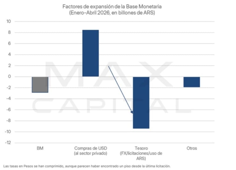 “La carga de vencimientos es inferior al promedio de los vencimientos que afrontó el Tesoro desde 2025 (en pesos constantes). Esperamos que el Tesoro esterilice, al menos, el billón que inyectó el BCRA por compras de divisas desde que liquidó la última licitación”, dijo Yarde Buller.
