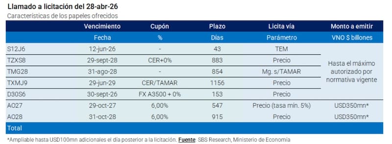 También se incluye un bono dual CER/TAMAR a junio de 2029, un dual a 2029 y la letra dollar linked al 30 de septiembre de 2026 (D30S6).