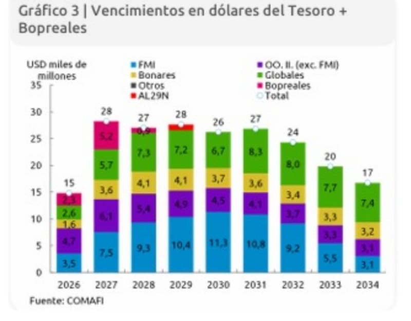 Este año la deuda en dólares del tesoro y del BCRA (Bopreales) alcanza los u$s 15.000 millones, saltando a u$s 28.000 millones en 2027.