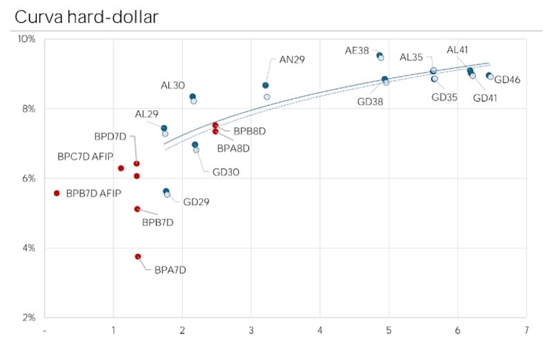 Los bonos de ley local, en cambio, operan con tasas mas elevadas en el tramo corto, en niveles de 8% a 8,5% en dólares.