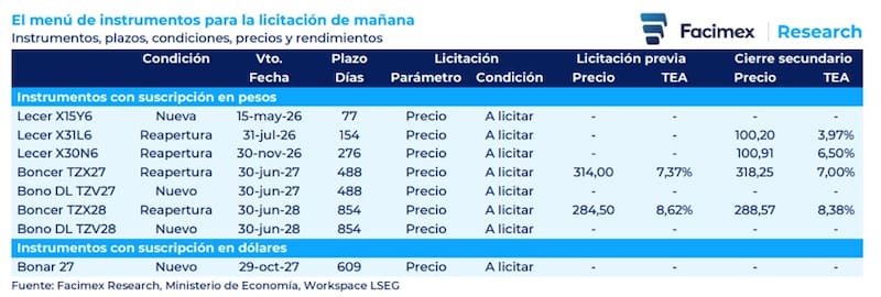 Maximiliano Tessio, asesor financiero, agregó que la incorporación de un bono hard-dollar a octubre de 2027 dentro del esquema de licitaciones quincenales en pesos es consistente con una estrategia del Gobierno orientada a concretar una emisión corta pre mandato, aprovechando un contexto financiero favorable con una emisión bullet hacia fines del mandato.