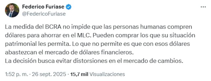 Federico Furiase, director del BCRA, aclaró en redes sociales: "La medida no impide que las personas humanas compren dólares para ahorrar en el MLC. Pueden comprar los que su situación patrimonial les permita. Lo que no permite es que con esos dólares abastezcan el mercado de dólares financieros. La decisión busca evitar distorsiones en el mercado de cambios".