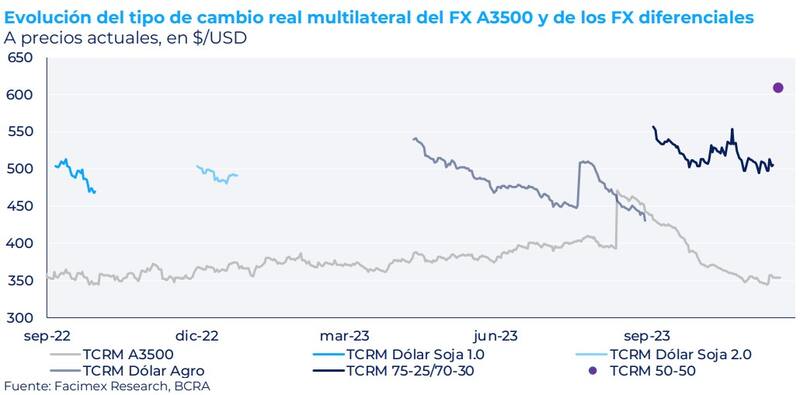 El nuevo régimen cambiario para los exportadores, que contempla liquidar el 50% de las ventas a través del tipo de cambio oficial y el otro 50% mediante el dólar financiero, implica un tipo de cambio de más de $ 620 y representa una mejora del 23% respecto a la cotización del esquema 70-30 que aplicó hasta el viernes pasado.