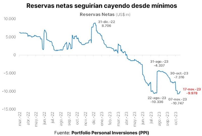 Por la menor oferta, se espera que el Central mantenga las restricciones en el acceso al dólar a los importadores. Pero, aún así, no lograría sumar divisas. Por lo tanto, PPI advierte que las reservas netas, que se ubican alrededor de u$s 10.000 millones negativos, seguirían cayendo en las jornadas que restan hasta el cambio de Gobierno.