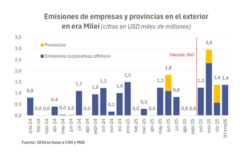 El impacto también se refleja en las reservas, pues con vencimientos corporativos relativamente bajos en el inicio del año, el balance entre emisiones y pagos deja un saldo neto positivo de dólares para la economía y facilita que el BCRA acumule divisas en el mercado oficial y refuerce su posición sin necesidad de convalidar un tipo de cambio más alto.