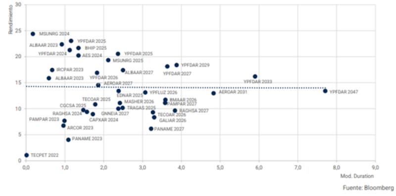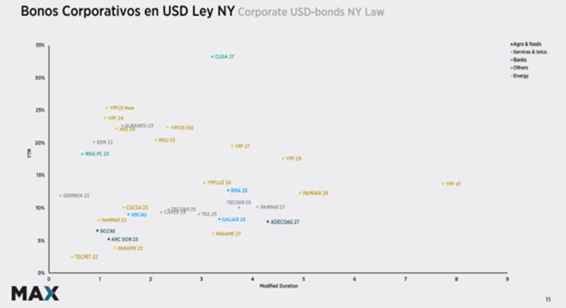 "El riesgo corporativo en dólares se muestra con rendimientos diametralmente opuestos a los activos del Tesoro Nacional. Vienen ofreciendo niveles de volatilidad mucho más bajos y paridades que se mantienen muy por arriba del riesgo soberano", dijo.