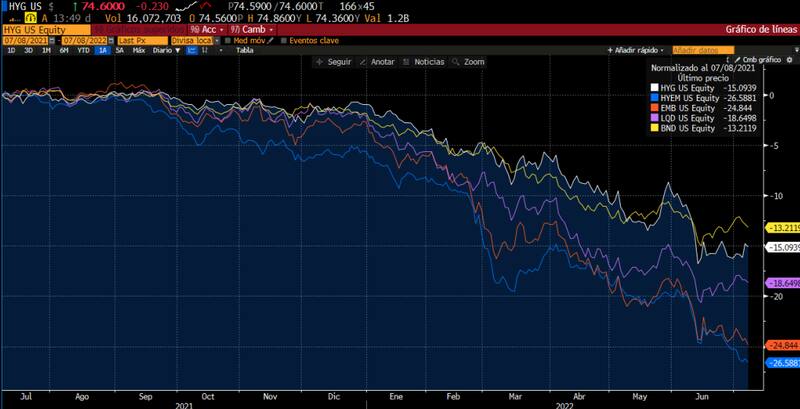 Los bonos de grado de inversión, la deuda corporativa de alto rendimiento en EE.UU. y el índice de bonos globales muestran perdidas en el último año del 18,6%, 15% y 13 por ciento, respectivamente.