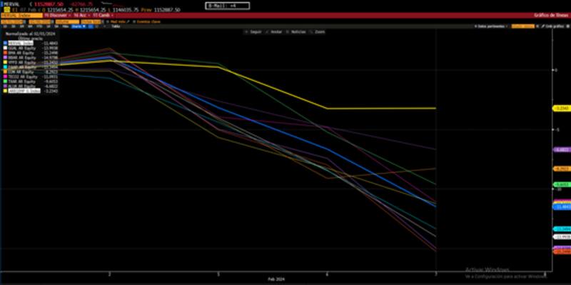Otros papeles como TGS, Cablevisión, Loma Negra, Central Puerto, TGN, Grupo Supervielle, Mirgor, YPF, Telecom, Cresud, Ternium, Edenor y Aluar bajan entre 3% y 11% en febrero.