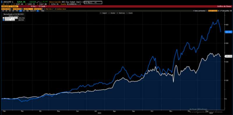 A su vez, este año, con una inflación cercana al 20% esperada para enero, las acciones en pesos suben en promedio 24%, medido por el S&P Merval. En comparación con el tipo de cambio, las acciones en pesos tiene una dinámica similar, ya que el dólar MEP sube 21% este año.