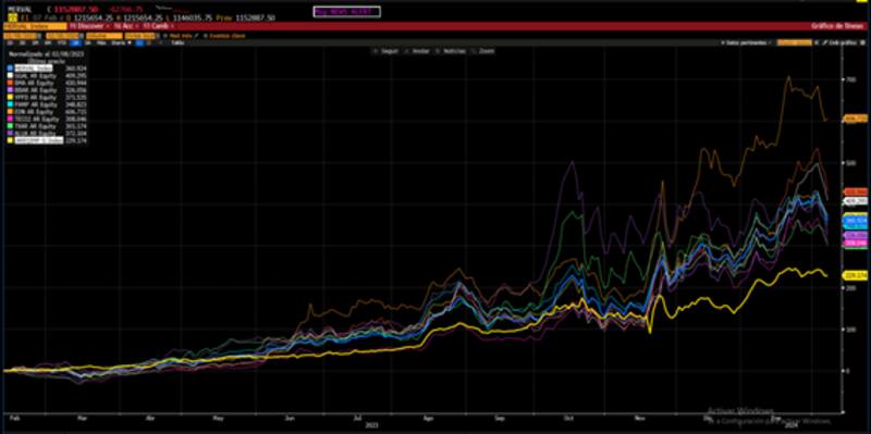 El año pasado, el rendimiento del S&P Merval en pesos más que triplicó al del tipo de cambio y superó ampliamente al de la inflación del 2023.