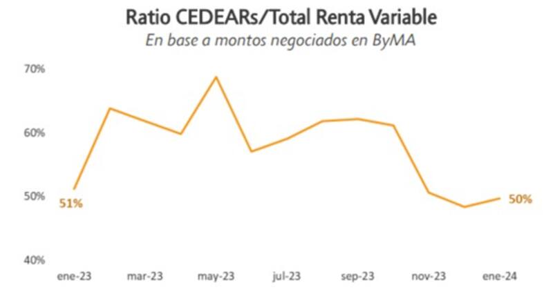 "Por este motivo, podemos ver que el volumen de las acciones creció a un ritmo más acelerado y el share entre Cedear y el equity local se fue equiparando", explicó.