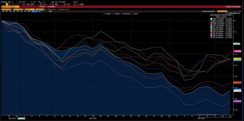 Luego se encuentran acciones como YPF, Pampa, Telecom, IRSA, Cresud y TGS que caen 17% en promedio desde los picos previos a las PASO.