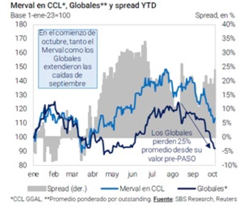 "Si bien reconocemos que el corto plazo estará marcado por la incertidumbre y preferimos cautela y mantener un beta bajo en acciones, mantenemos una visión constructiva para el mediano plazo, tanto para Globales como para el Merval. En este último con foco en el sector hidrocarburos. En ese sentido, creemos que, de posicionarse en estos tipos de activos, preferimos GD41 en Globales y en papeles defensivos en acciones como Aluar, Ternium y BYMA", dijeron desde Grupo SBS.