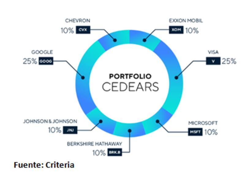 La cartera de Cedear recomendada por Criteria está compuesta por un 10% en Exxon Mobil, 10% en Chevron, 25% en Visa, 25% en Alphabet, 10% en Microsoft, 10% en Bershire Hathaway y 10% en Johnson & Johnson.