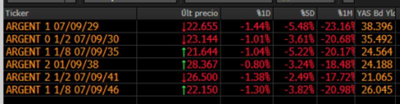 En el último mes, todos los bonos caen más de dos dígitos, con pérdidas del 20% al 23% en el tramo corto y con bajas del 17% al 21% en el tramo más largo.