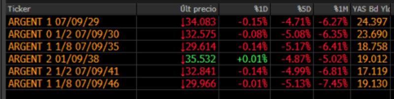 Con el ajuste actual, los bonos argentinos muestran una pérdida de entre 6,8% y 7,8% en lo que va del año en los distintos tramos de la curva. Así, los rendimientos volvieron a desplazarse al alza, con la parte más corta rindiendo por encima del 24% y la parte mas larga con retornos del 19%.