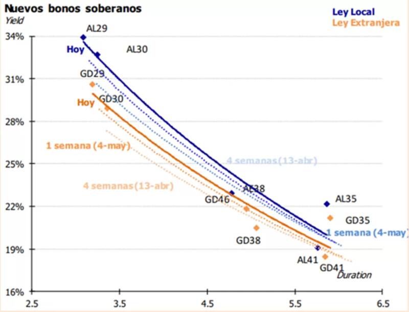 Los bonos argentinos de ley local rinden 34% en el tramo corto (en el AL29) y 19% en el extremo más largo (AL41).