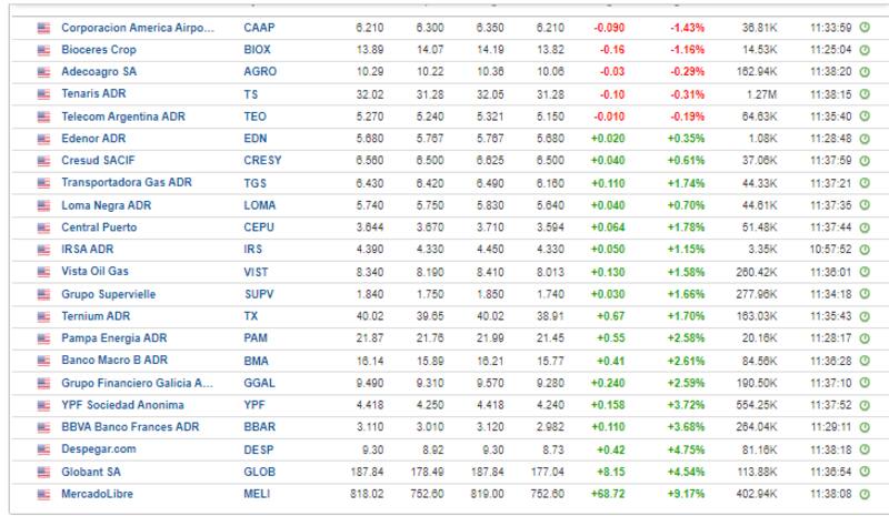 Las acciones argentina operan en su mayoría en verde. Las ganancias son lideradas por MercadoLibre que sube 9%, seguido por Globant y Despegar que suben 4,5% y 4,7% respectivamente.