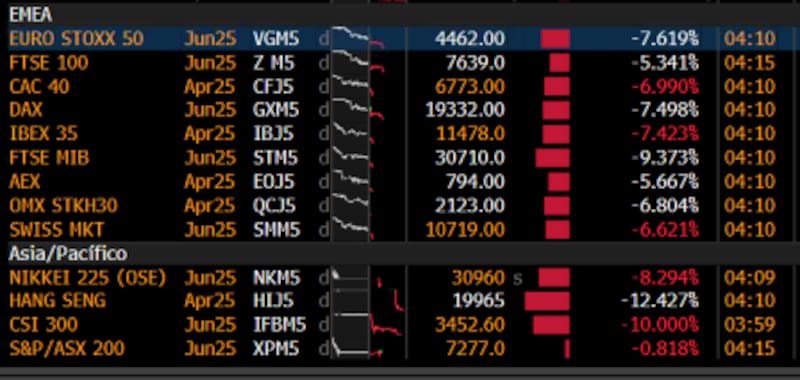 Un crack financiero global se inició con la apertura de las ruedas de operaciones en Asia con caídas del orden del 10%, mientras que las bolsas europeas caían en promedio más de 7%, en el histórico sell off mundial que se produce como consecuencia de la guerra comercial desatada por los EE.UU. con los aranceles globales a las importaciones.