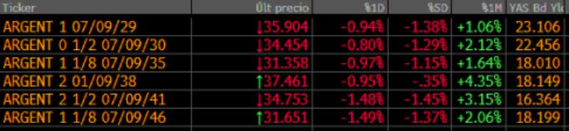 El AL30D perdió un 0,76%, mientras que el AL35D sufrió una baja del 2,13 por ciento. El AL29D cayó un 1,56 por ciento.