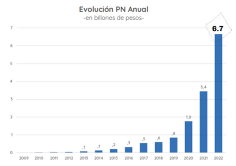 Durante 2022, la industria de fondos pasó de administrar $3,4 billones, para finalizar el año en $6,7 billones, mostrando un crecimiento del 93%, lo cual es, según los analistas de Portfolio Personal Inversiones, muy por arriba del promedio de 70% anual de los últimos 5 años y del 67% si miramos desde 2012.