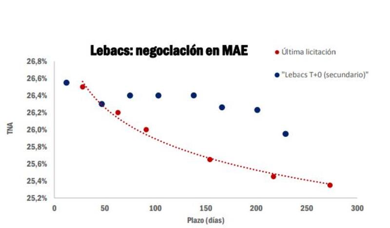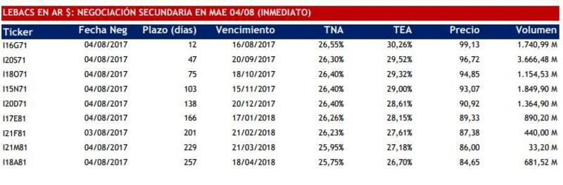 En el mercado secundario las letras a 12 días ofrecen una tasa de 26,55% las de 47 días 26,30%, 75 días de 26,40%, 103 días de 26,40%, 138 días 26,40%, 166 días 26,26%, 201 días 26,23%, 229 días 25,95% y de 257 días de 25,75%.
