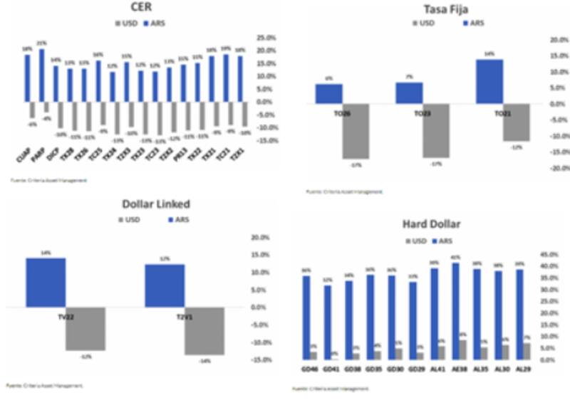 Según cálculos de Criteria, ponderando en un 50% y 50% la probabilidad de lograr un acuerdo con el FMI; el potencial de los bonos en dólares seria del 5% en promedio para los distintos tramos de la curva con un horizonte de inversión hasta el 30 de junio del corriente año.