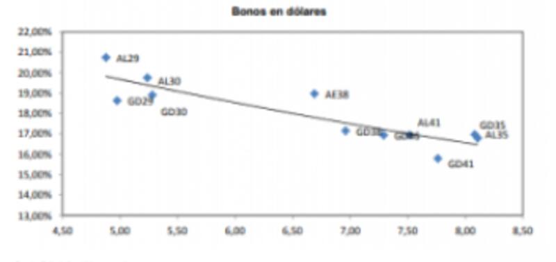 Al analizar la dinámica de los bonos en dólares se nota claramente la falta de interés de los inversores. Tanto los bonos de ley local como de ley NY tienen sus curvas invertidas, desplazadas al alza. La curva de legislación extranjera rinde 18% en la parte corta y por encima del 15% en la parte larga. A su vez, los bonos de ley local rinden 21% en la parte más corta.