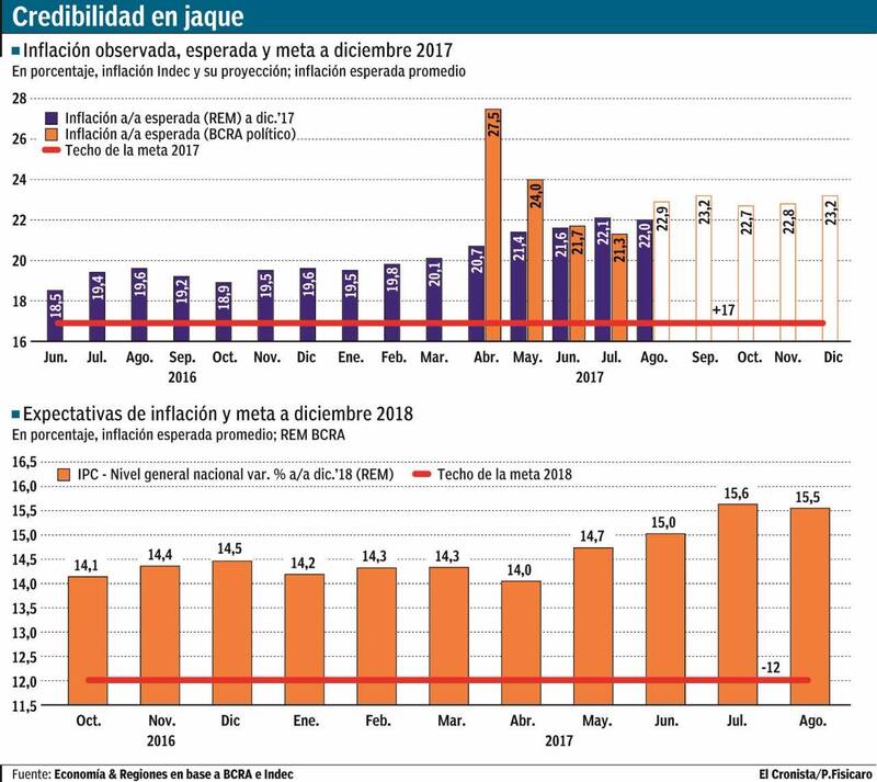 La inflación del Indec marcó un avance de 1,7% en julio, luego del 1,2% y 1,3% de junio y mayo, respectivamente. Para agosto la mediana de expectativas está en 1,4% y el dato oficial se conocerá esta semana. La meta para este año es de no más del 17%, mientras que la de 2018 es del 10% (con dos puntos de margen hacia arriba y hacia abajo).
