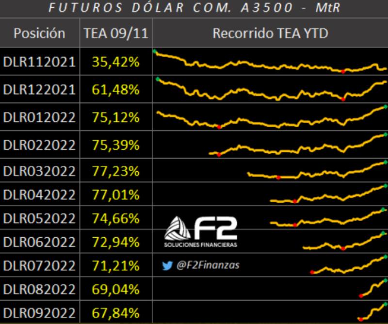 También se puede percibir ello en los precios que se acuerdan entre las partes en Rofex. "Los futuros del dólar siguen marcando máximos de tasas implícitas", señaló Andrés Reschini de F2 Soluciones Financieras, en referencia a las tasas efectivas anuales.