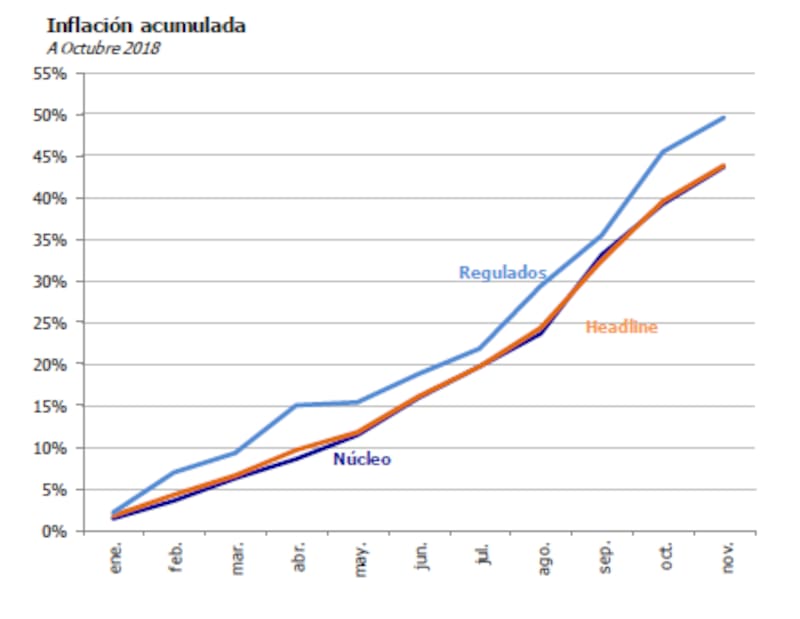 Miguel Kiguel, economista y director de Econviews sostuvo que, medida contra noviembre 2017, la inflación nacional trepó a 48.5%, mientras que la inflación núcleo mostró una suba de 46.2% y la inflación en regulados alcanzó el 63.2% interanual. “Trascurridos once meses de 2018, la inflación nacional acumulada llegó a 43.9%, muy por encima del 21% acumulado a noviembre del año pasado , comentó.