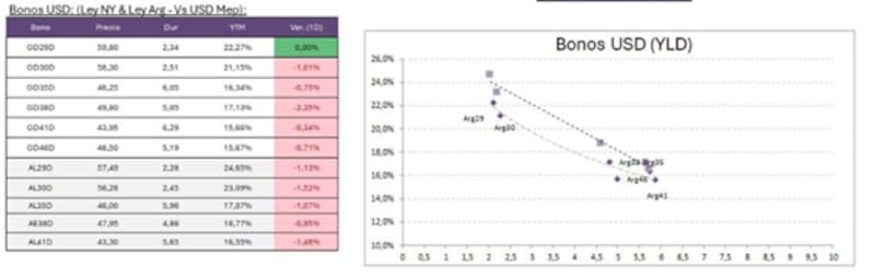 Desde el lado de la estrategia, desde Research Mariva se encuentran en una postura de cautela con relación a los bonos y por ello prefieren los Bopreales, como activos de menos volatilidad, y dentro de la curva de soberanos ven valor en el GD35.