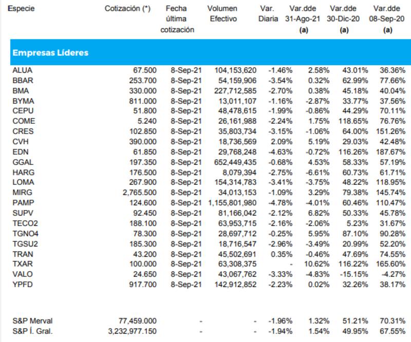 Entre las acciones del panel líder prácticamente todas fueron caídas, con apenas dos excepciones.